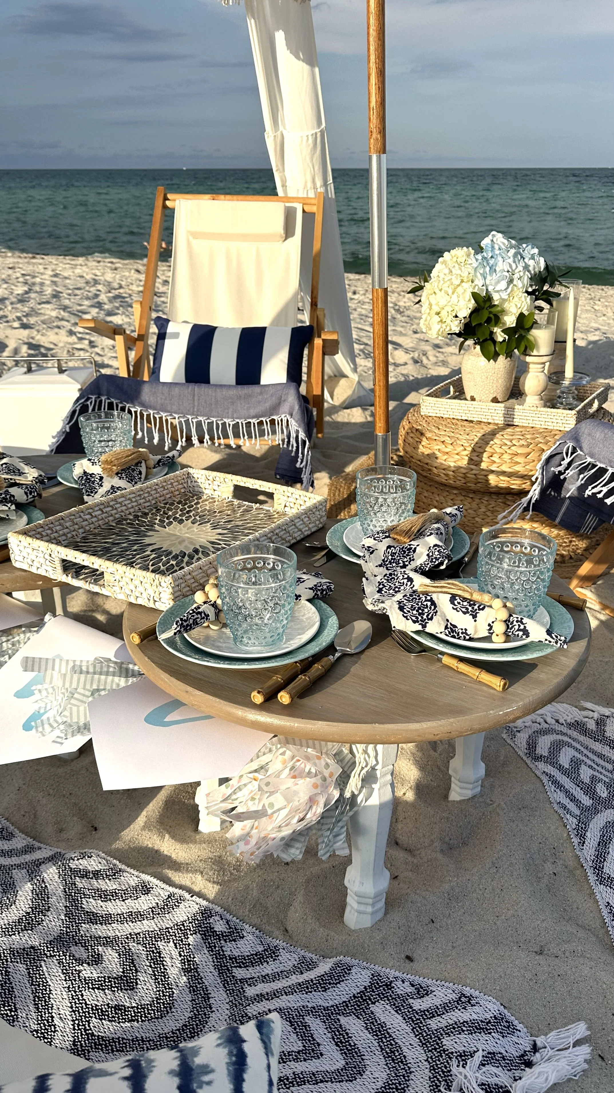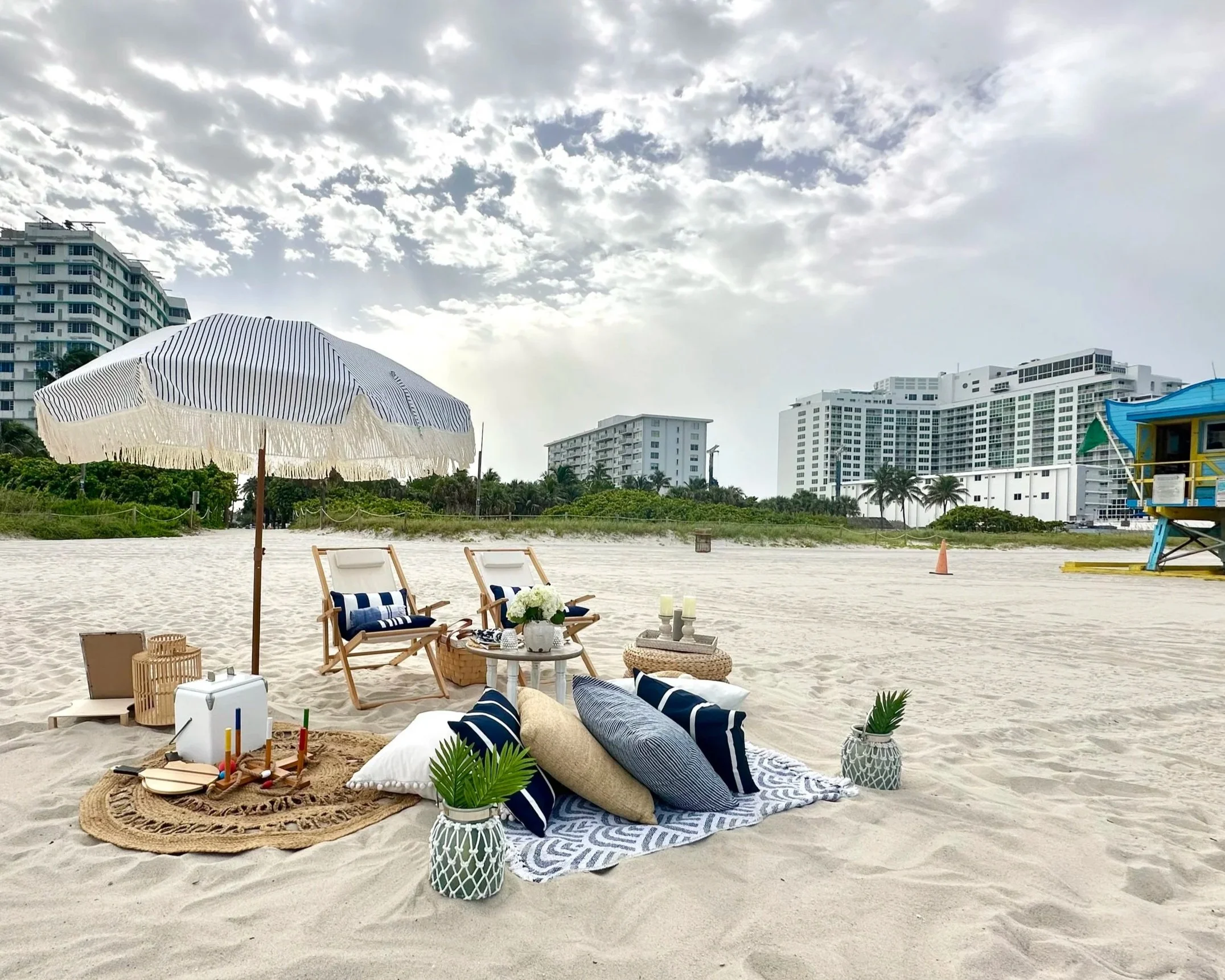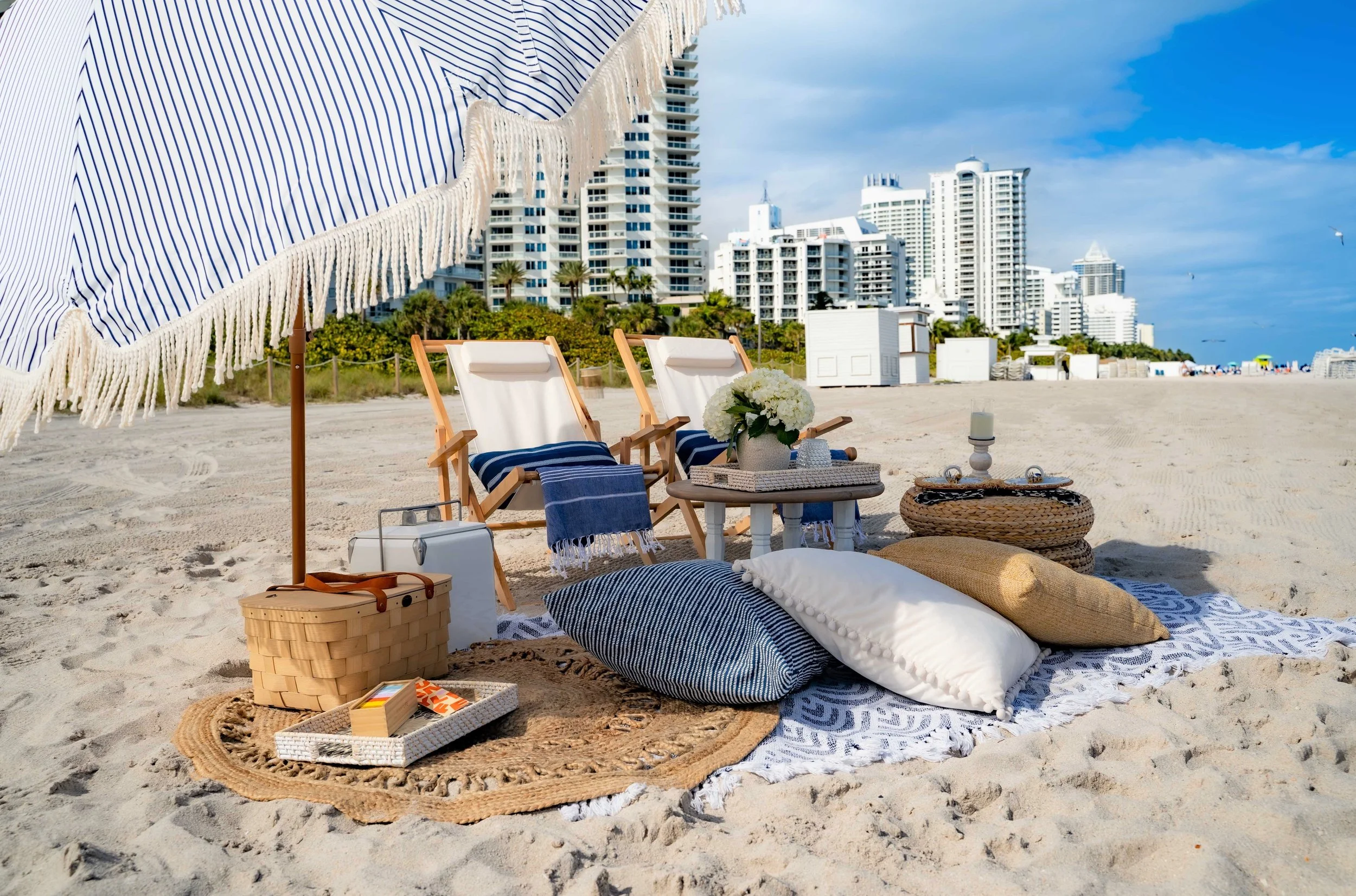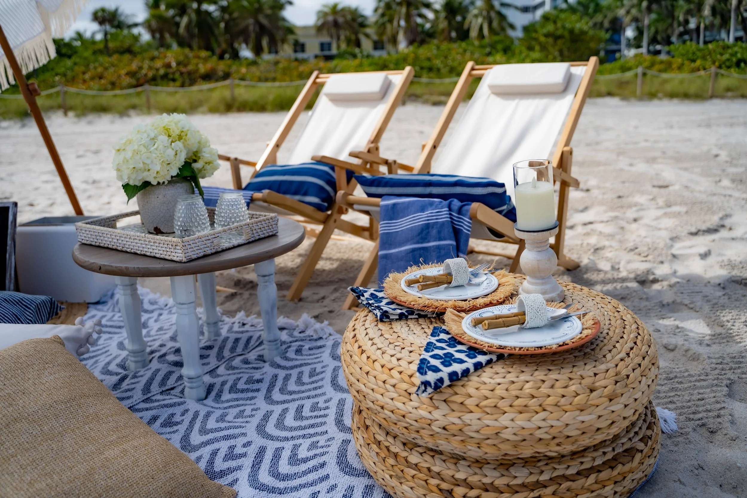 Let this tailored cabana picnic offer a refreshing setting for your next casual celebration, baby’s 1st birthday, or low-key proposal. Designed for small groups with a preppy New England vibe and nautical stripes, it can be upgraded with added time for a longer beach day, luxury Adirondack chairs, or a cake smash table. Or choose the umbrella version for a cost-effective option.