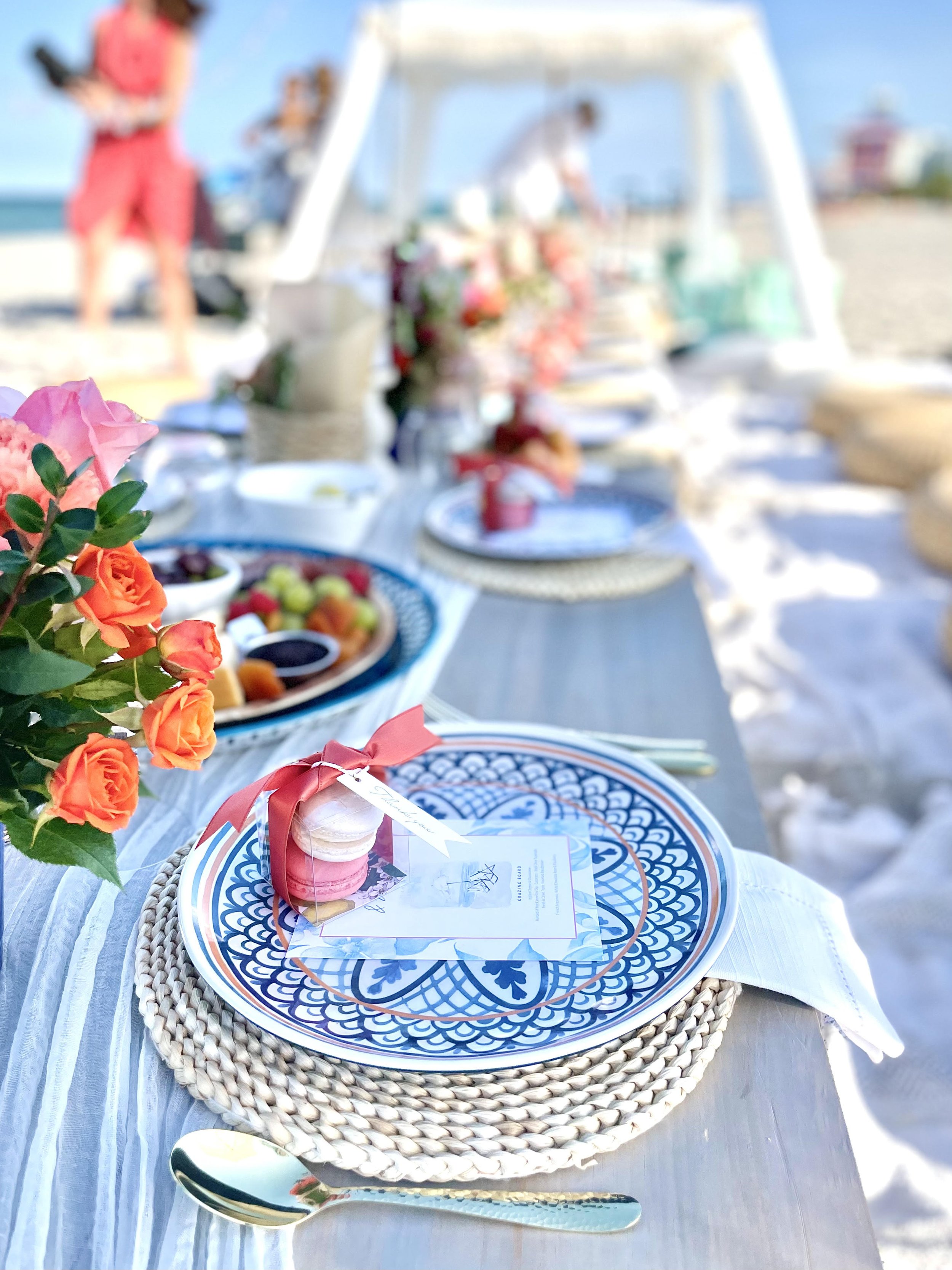 This 3-hour Mediterranean-style picnic setup combines aqua and teal with Old-World tile motifs, lime-washed wood, damask prints and tapestries, flax linen, and sunny lemon accents to interpret the romantic Ionian coastline. Bougainvillea-hued fresh florals add the finishing touch. The style serves a range of events, from Mama Mia-themed bachelorettes to whimsical engagement parties and charming picnic weddings. Upgrade with canvas beach chairs for added comfort, a shaded catering table for buffet display (catering not included), or a fourth hour to create a complete beach day. Please note - we do not provide coolers for large groups.