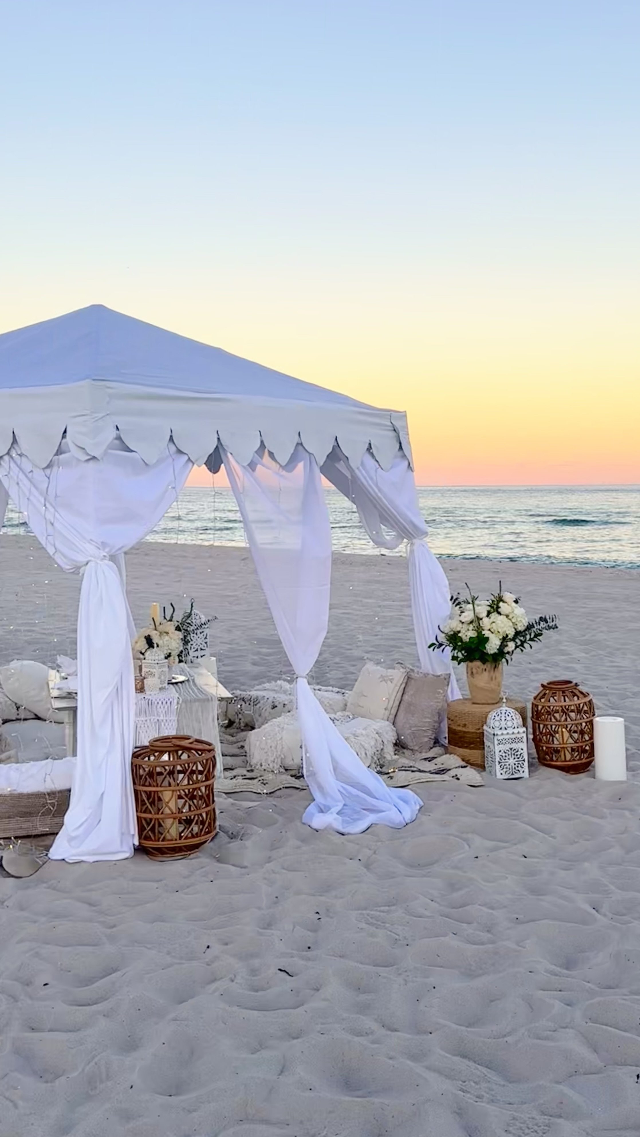 Designed for a daytime or sunset wedding proposal or post-ceremony elopement, the all-ivory palette of THE OASIS is classic and bridal, with a touch of Moroccan romance. Berber poufs, a sequined Moroccan wedding rug, and Marrakesh metal lanterns sweep you away for an unforgettable beach experience.