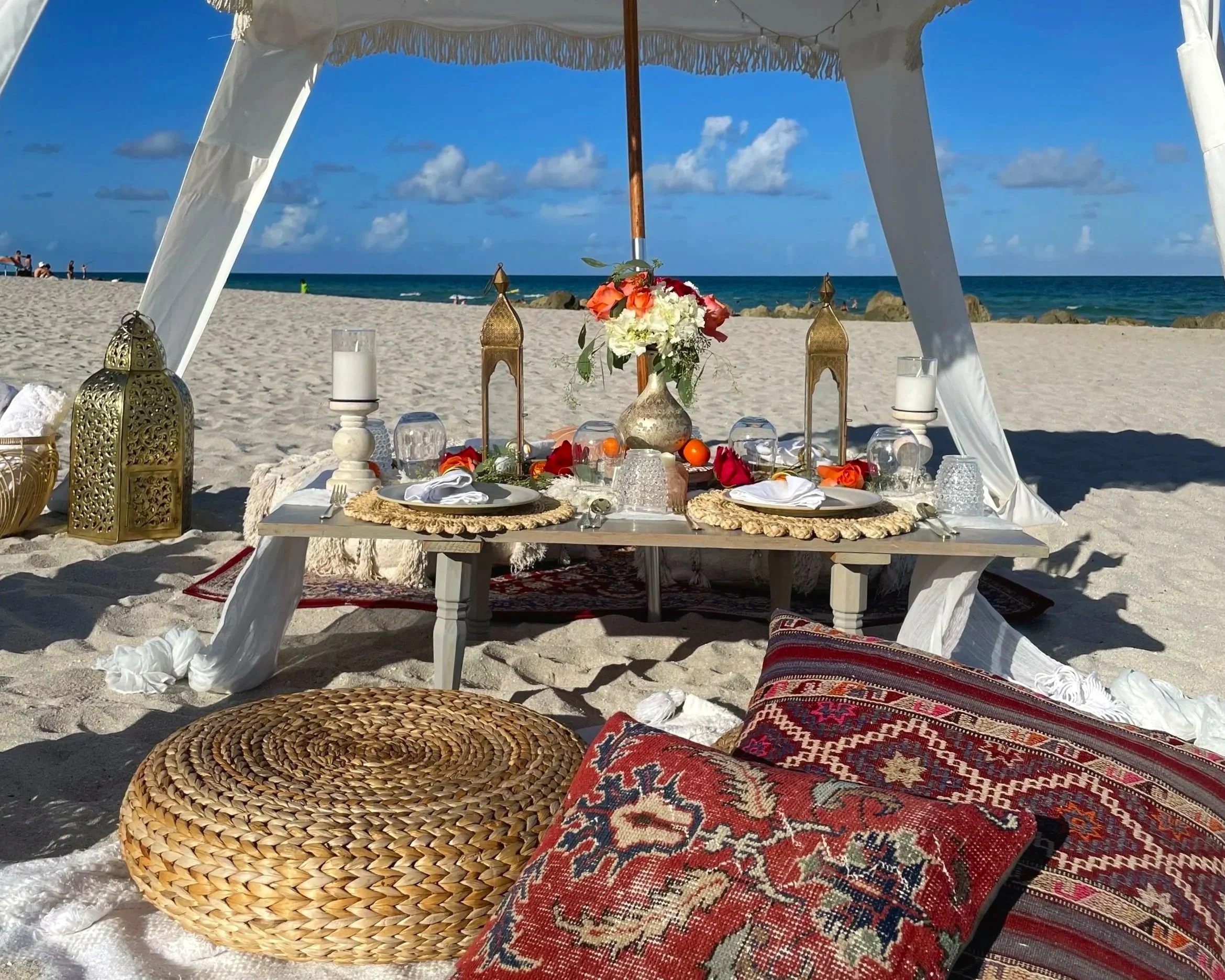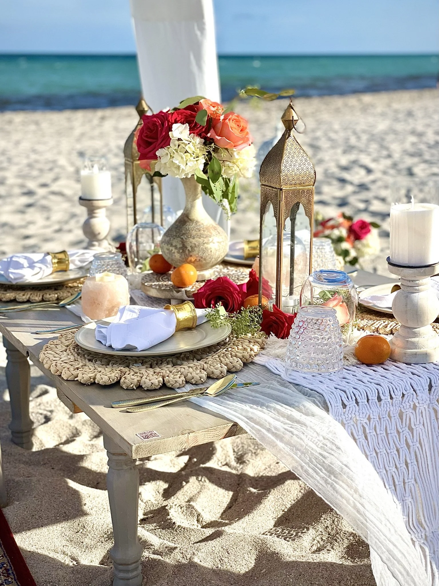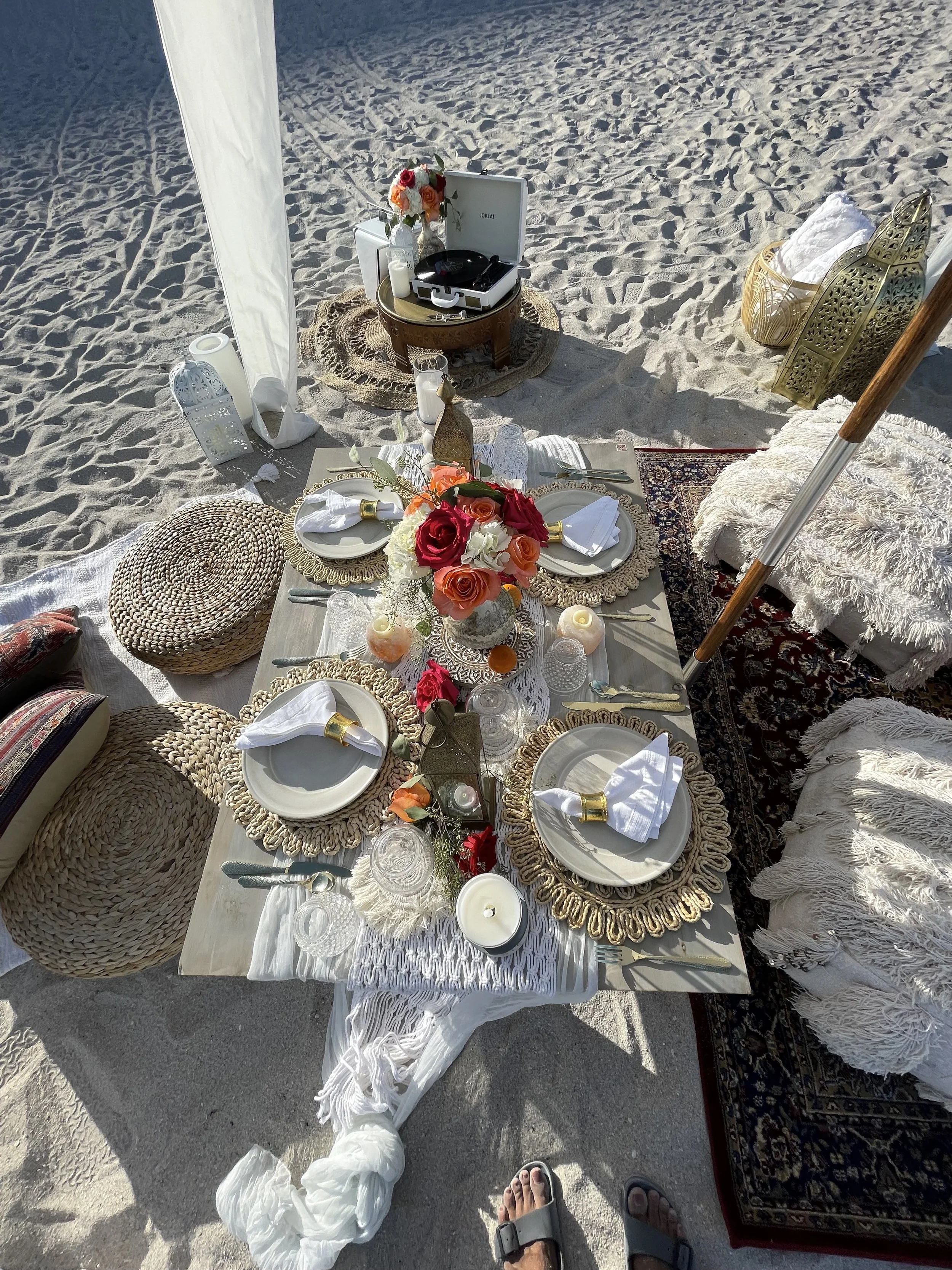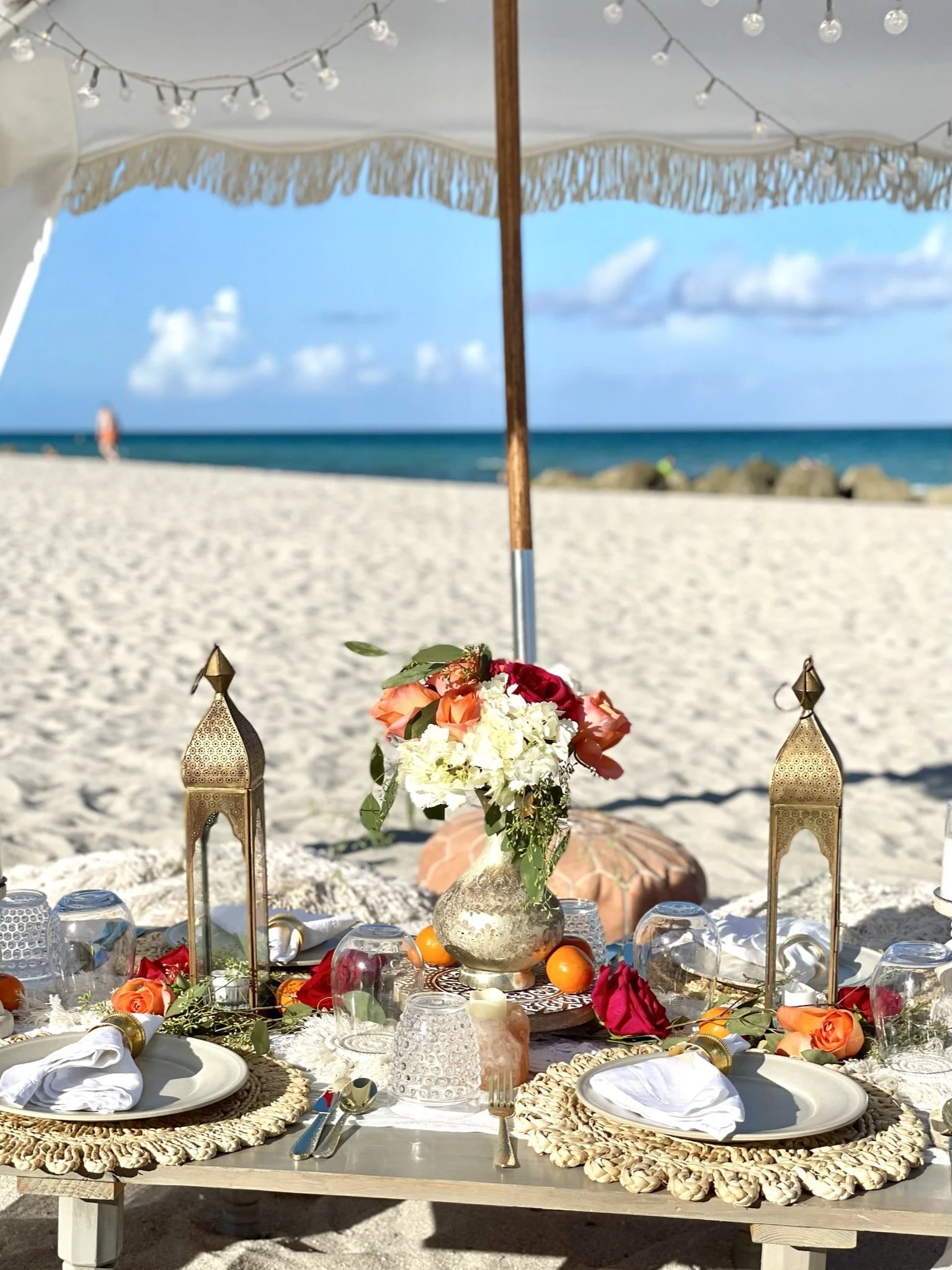 A romantic cabana picnic that plays on the golds, roses, and citrus oranges of our favorite bohemian destination. Enhance the experience with a classic LP player for that 60s vibe or add butterfly chairs to better the sunset. For a more bridal engagement look, the CASABLANCA version comes in an all -white and metallics palate. See PROPOSALS below.