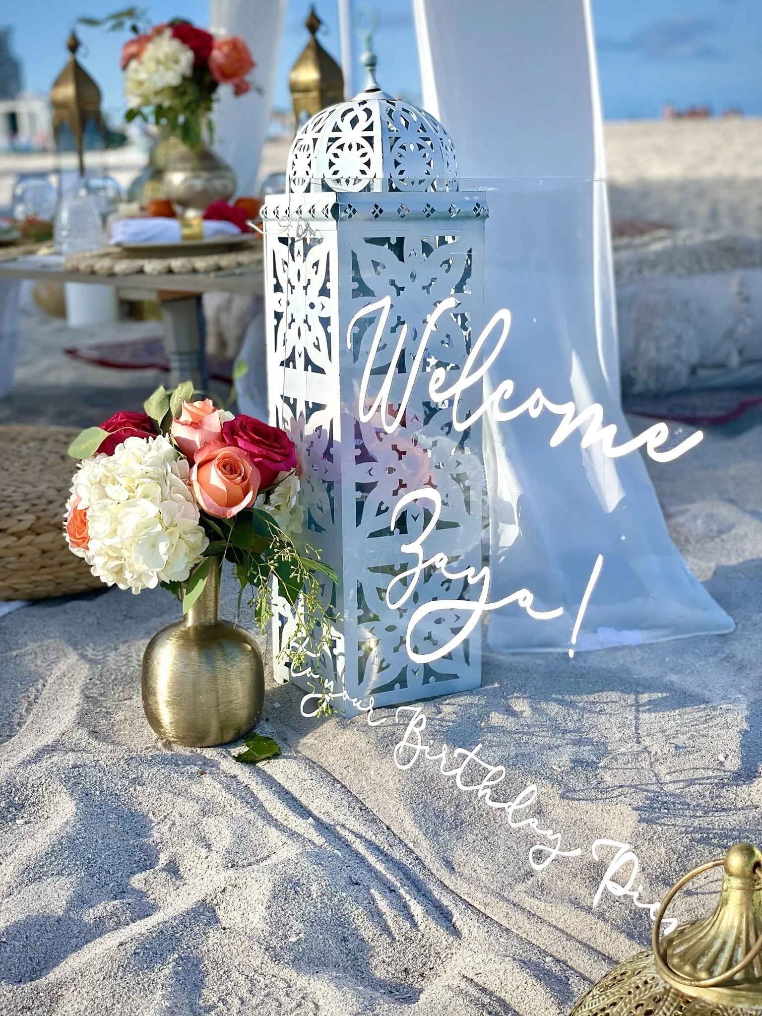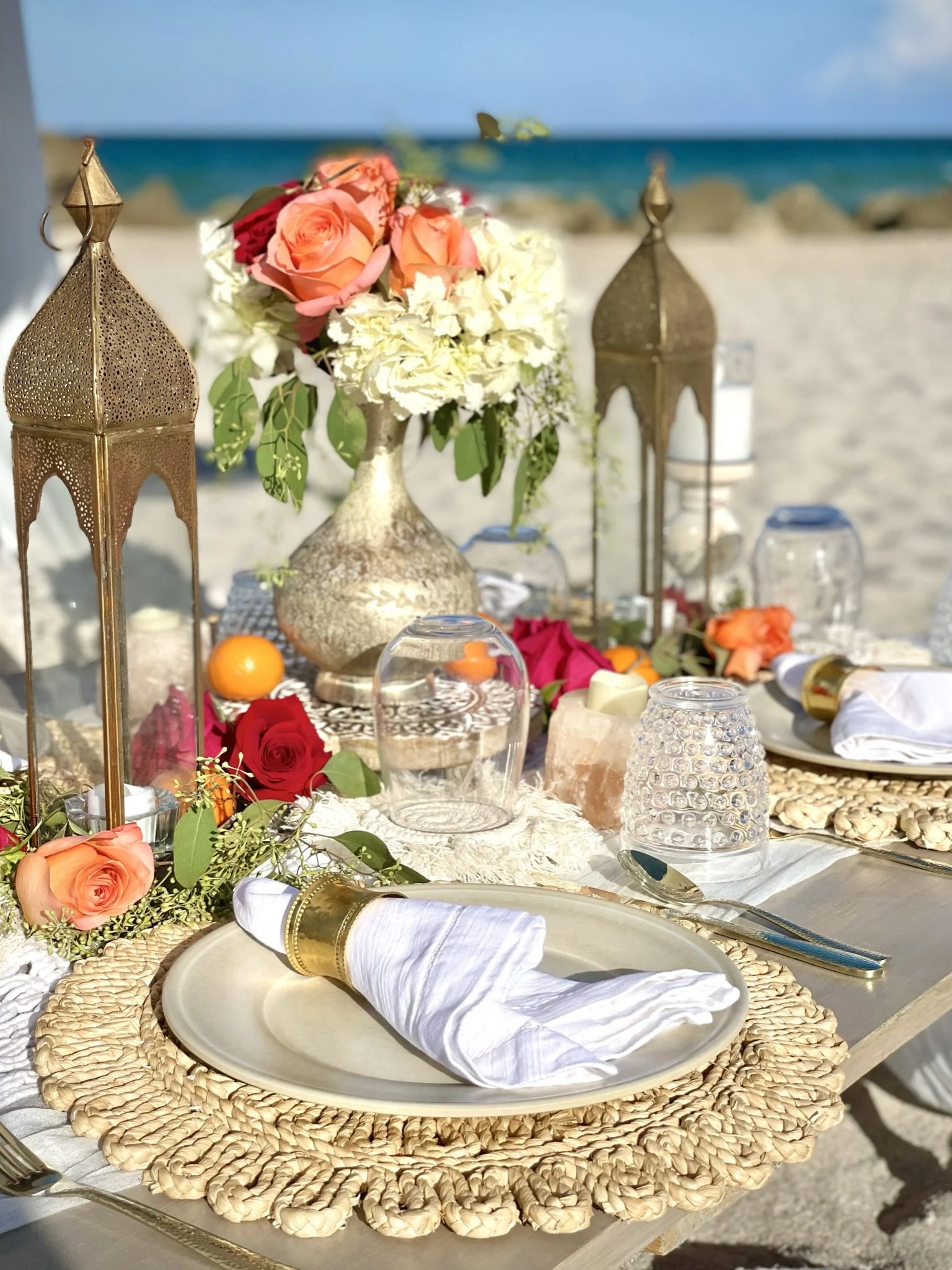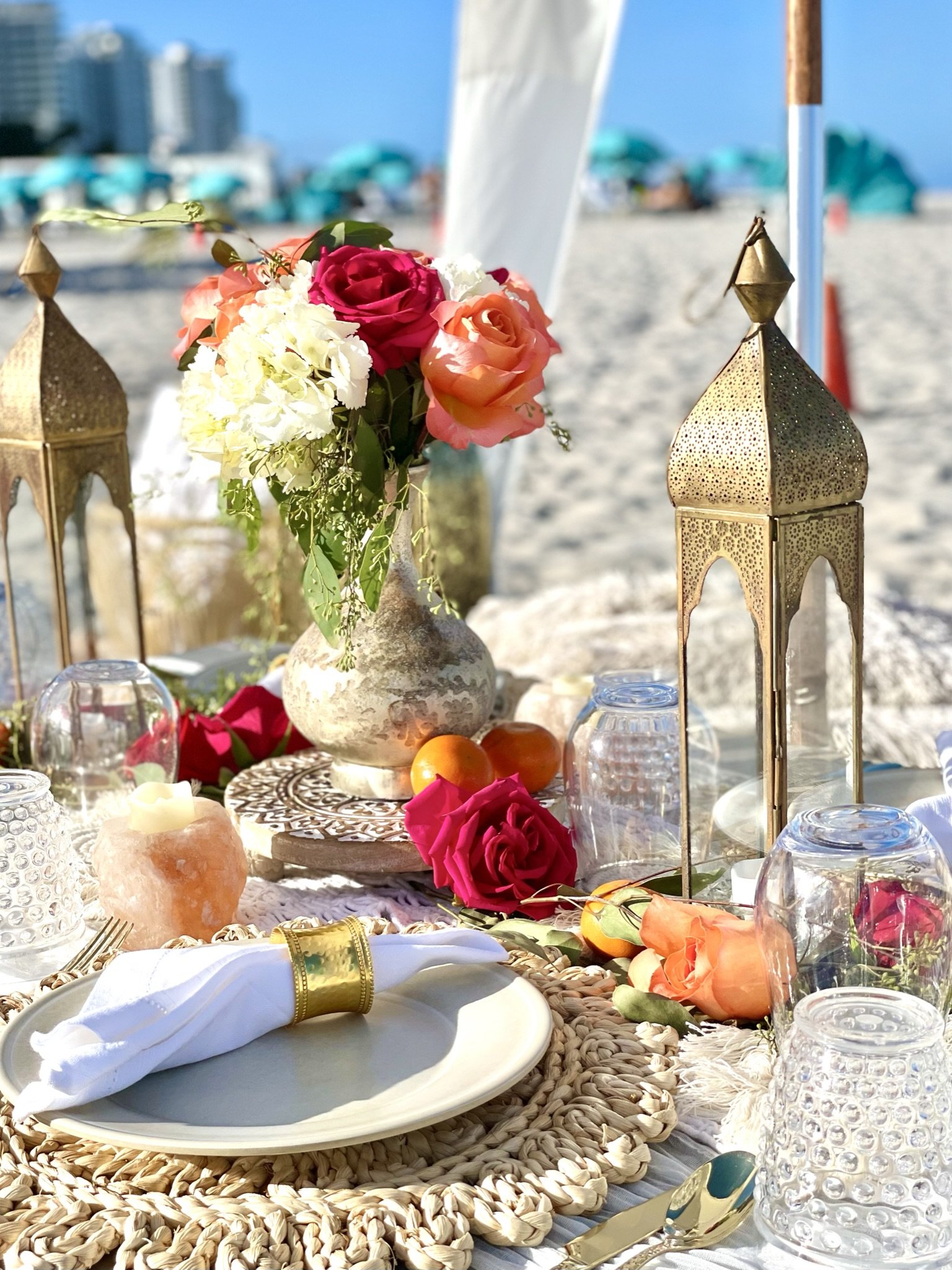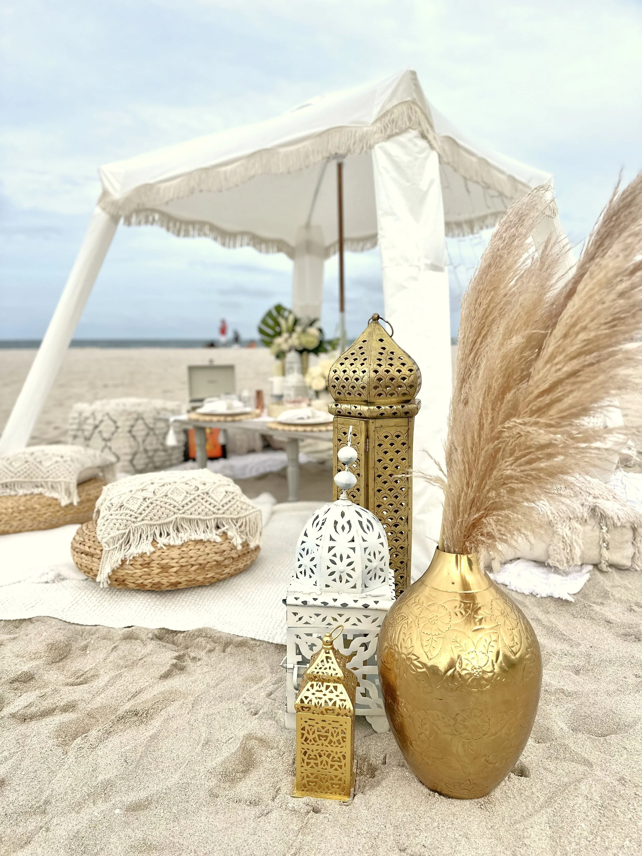 A romantic cabana picnic that plays on the golds, roses, and citrus oranges of our favorite bohemian destination. Enhance the experience with a classic LP player for that 60s vibe or add butterfly chairs to better the sunset. For a more bridal engagement look, the CASABLANCA version comes in an all -white and metallics palate. See PROPOSALS below.