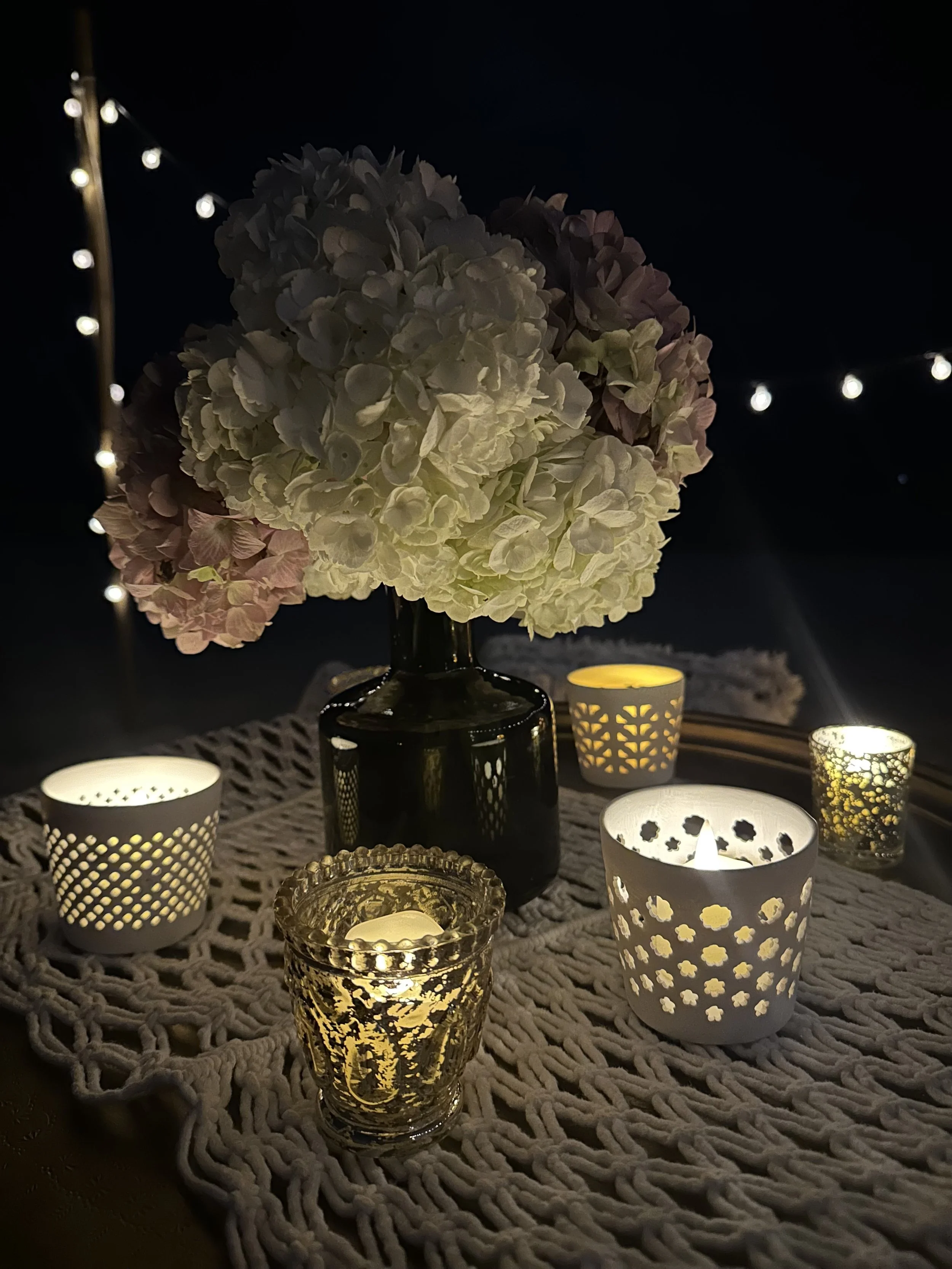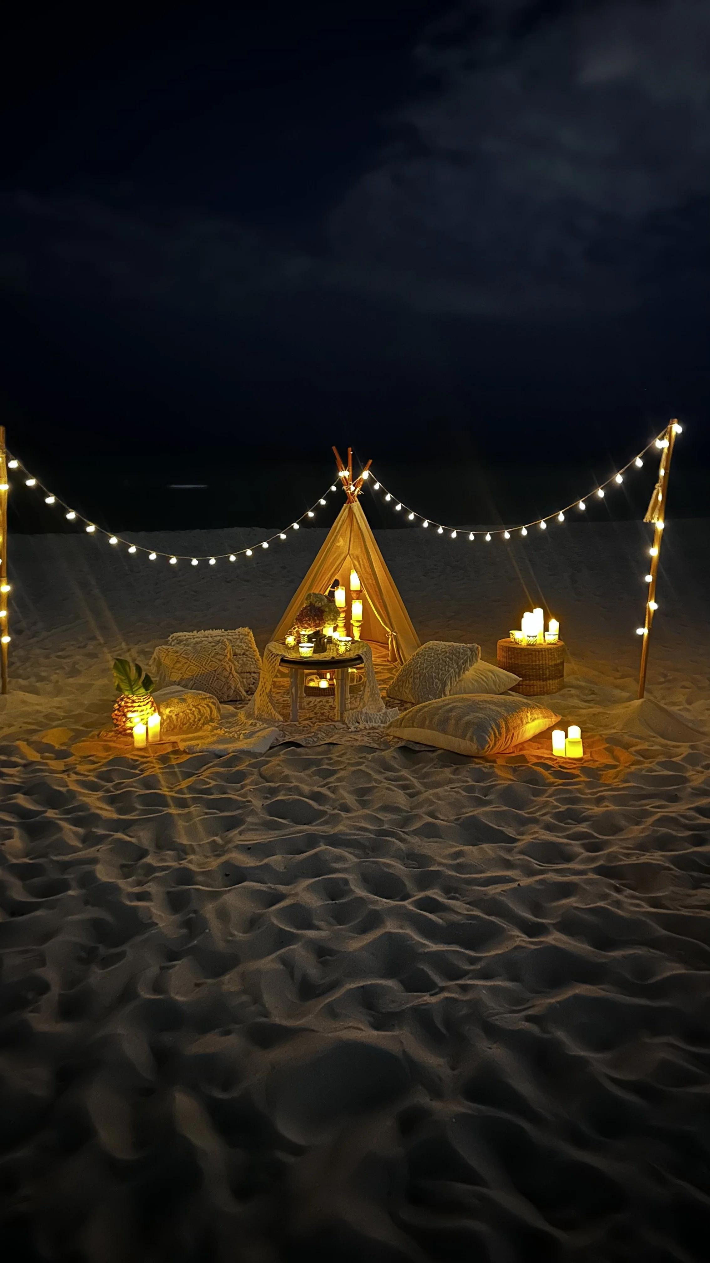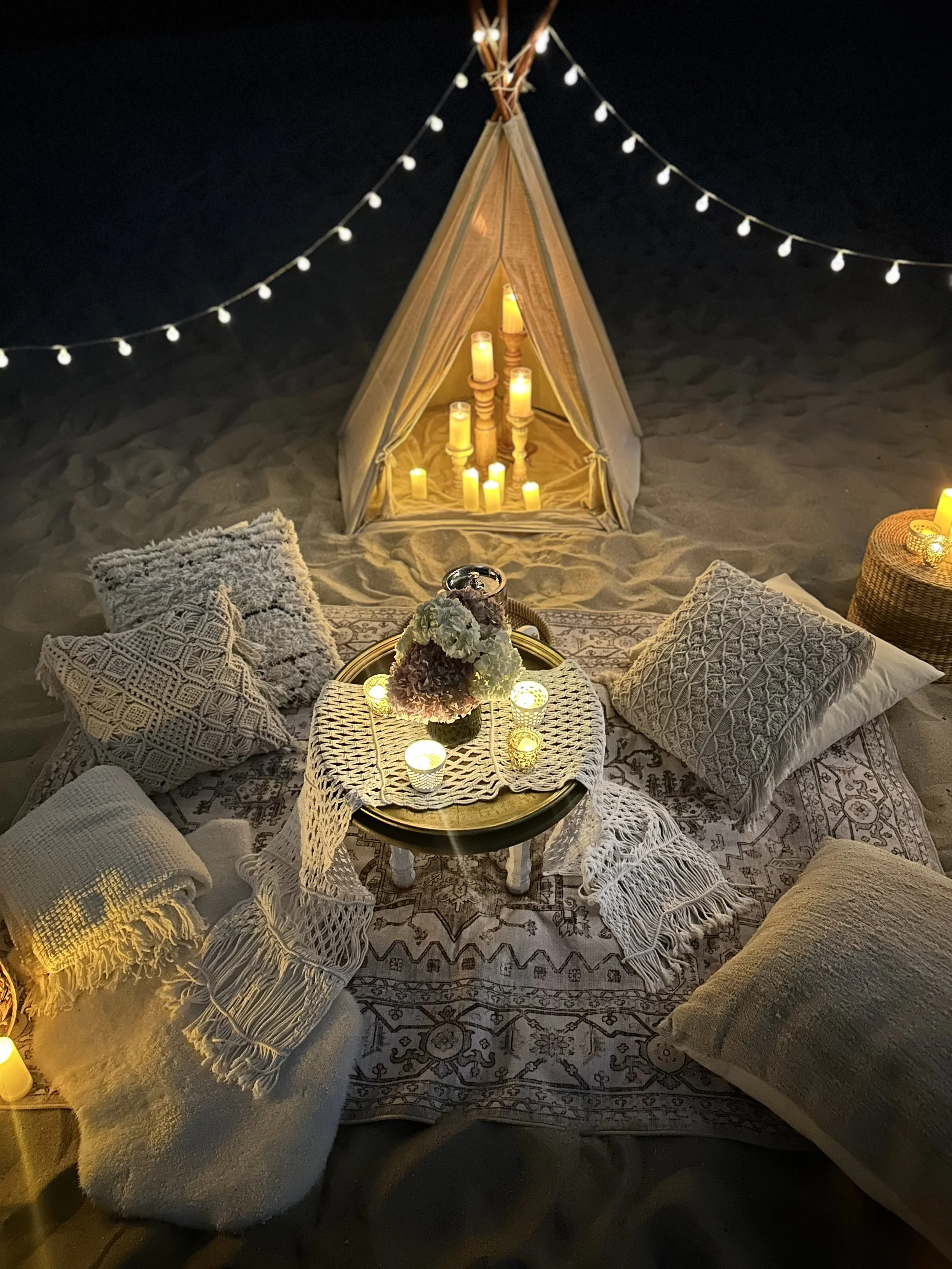 Whether your plan is to propose after dinner or on a stroll to the shore, this quintessential boho setup takes advantage of the beach’s night-time romance.